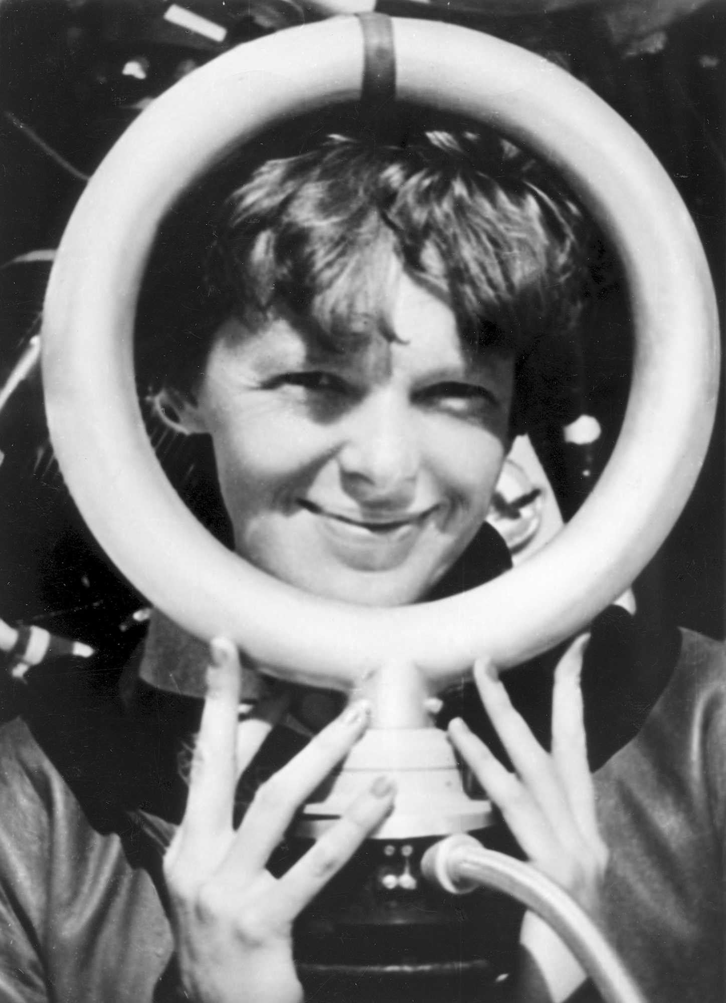 pic: Amelia Earhart Holding Bendix Radio Direction Finder Loop Antenna